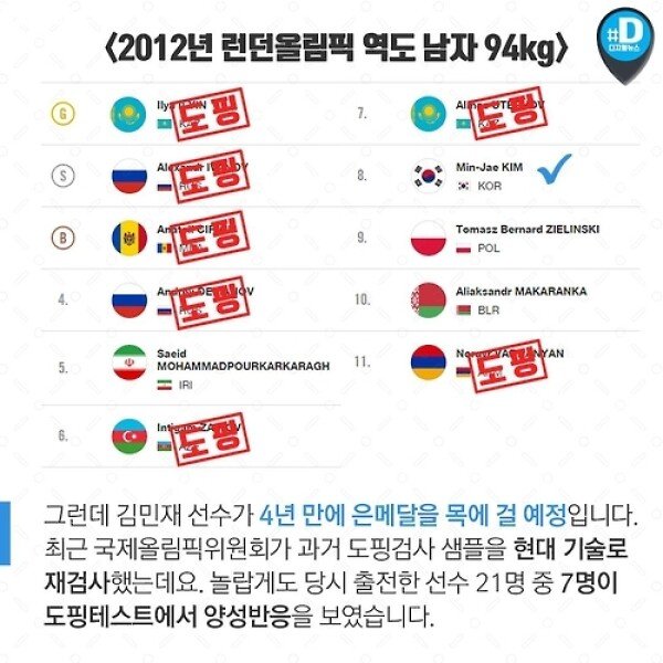 국제역도연맹에 따르면 런던올림픽 남자 역도 94kg급에서 금은동메달리스트와 46711위 선수 등이 도핑에 적발된 것으로 확인됐다는데요. 그런데 4년이 지난 지금 국제 역도 연맹에서 발표한 금지약물로 조사받는 선수 명단에 런던 올림픽 역도 94kg급에서 금메달 은메달 동메달을 딴 선수가 모두 금지약물 복용이 걸렸고 그 뒤로 4위 6위 11위를 차지한 선수도 약물 복용이 적발되었습니다. 2012 런던올림픽에서 8위를 기록했던 남자 역도 중량급 간판 김민재 33ㆍ경북개발공사가 은메달리스트가 될 전망이다.