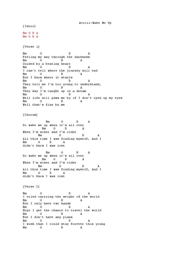 Wake Me Up Avicii Chords and Lyrics for Guitar. Intro Bm G D A Bm G D A Verse 1 Bm G D D Feeling my way through the darkness Bm G D D Guided by a beating heart Bm G D D I cant tell where the journey will end Bm G D D But I know where it starts Bm G D D They tell me Im too young to understand Bm G D D They say Im caught up. Author Viktororosso a 62.